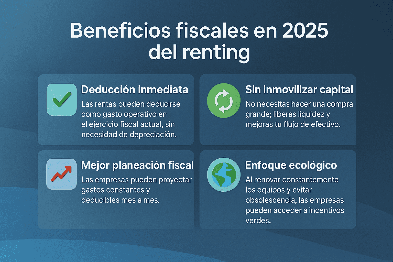 El renting no solo es práctico: en 2025 también es estratégico. Aprovechar los beneficios fiscales actuales puede ayudarte a optimizar el presupuesto, acceder a mejor tecnología y enfocarte en lo que importa: hacer crecer tu empresa.